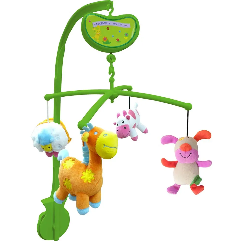 Muzička vrteška za bebe sa mekanim igračkama u obliku životinja.