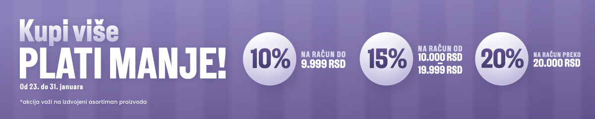 10% popusta na kupovine do 9.999 RSD 15% popusta na kupovine od 10.000 do 19.999 RSD 20% popusta na kupovine preko 20.000 RSD
